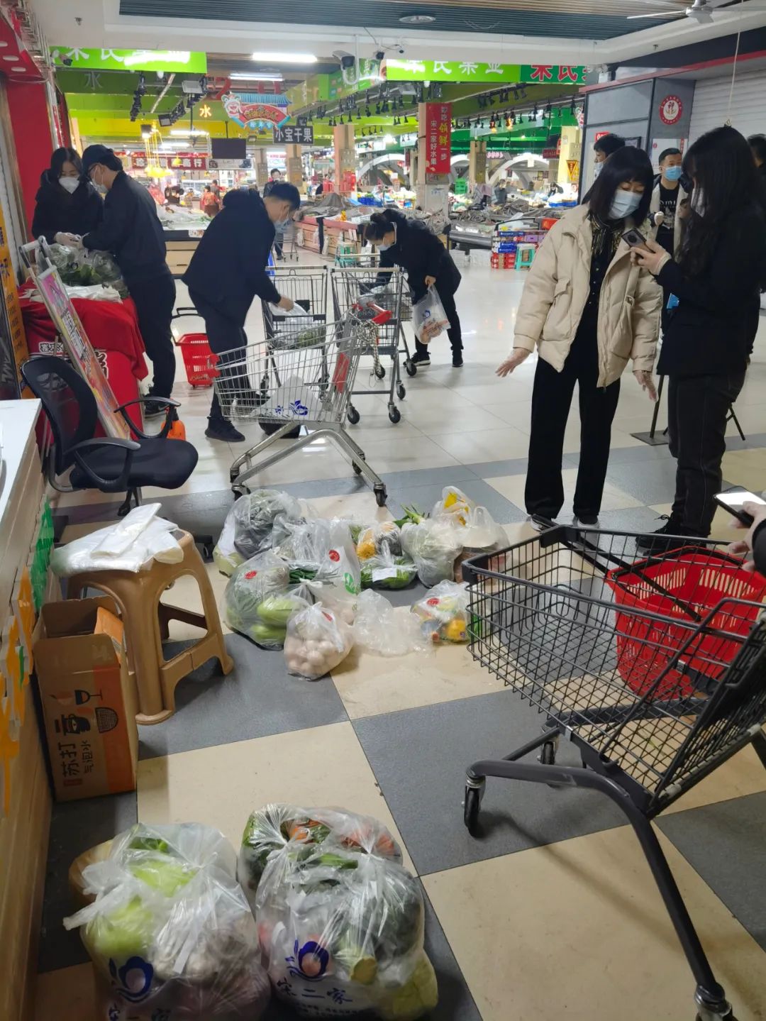 隨著疫情管控的發(fā)展,“中天農(nóng)貿(mào)市場”線上小程序訂單量飆升,每天增加到200多單,每一單貨物少則幾個物品,多則十幾種甚至二十幾種菜品,大家需要到各個攤位上分揀菜品,再經(jīng)過商戶的過秤,才能裝好袋子配送。因?yàn)槠奉惒煌?、廠家不同、是否有貨物等關(guān)系,選購的過程中需要不斷地與訂單客戶電話溝通,每一次溝通都需要有足夠的耐心和解釋。3月18日,一個訂單留錯了電話號碼,分店經(jīng)理東巨峰頂著“騷擾電話”的罵名,尋找了二個多小時,才找到買家。