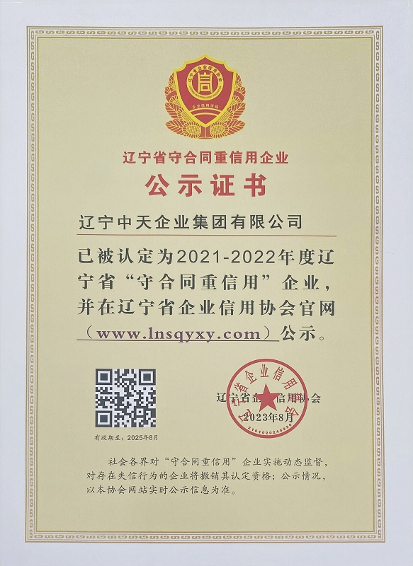 2023年8月,集團被遼寧省企業(yè)信用協(xié)會認定為2021-2022年度遼寧省“守合同重信用”企業(yè)和信用等級5A級企業(yè),這是中天企業(yè)集團自2005年以來,連續(xù)第19年獲此殊榮,既是對我們過去經(jīng)營中取得成績的肯定,也是對我們今后經(jīng)營和發(fā)展中所給予的希望和所提出的要求。中天企業(yè)集團成立至今,始終以“誠信為本,服務(wù)至上”為經(jīng)營理念,在企業(yè)發(fā)展中,將誠信貫穿經(jīng)營以及對客戶服務(wù)的全過程,把誠信作為企業(yè)的創(chuàng)業(yè)之本,立業(yè)之基。未來,我們將矢志不渝的堅持用誠信打動客戶,以誠信塑造品牌,打造誠信企業(yè)品牌。