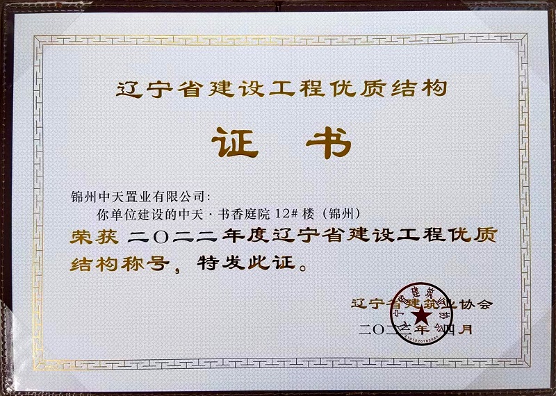 錦州中天·書香庭院一期項(xiàng)目9棟樓被遼寧省建筑行業(yè)協(xié)會授予“省建設(shè)工程優(yōu)質(zhì)結(jié)構(gòu)”稱號。這代表著遼寧省建筑施工質(zhì)量管理的最高水平,彰顯了中天在工程項(xiàng)目管理、工程品質(zhì)、技術(shù)創(chuàng)新等領(lǐng)域的卓越實(shí)力。