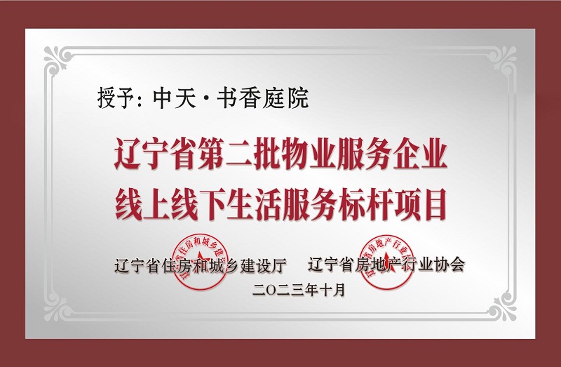 5、營口中天·書香庭院項(xiàng)目獲“省物業(yè)服務(wù)標(biāo)桿項(xiàng)目”稱號