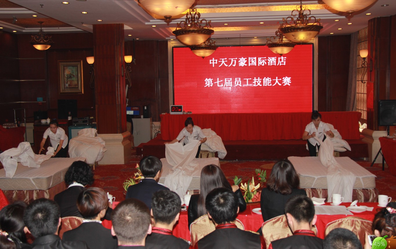 中天萬豪國際酒店一年一度的技能大賽,是檢驗(yàn)酒店員工業(yè)務(wù)技能水平的一個(gè)平臺(tái),是擇優(yōu)選拔技能高手的一次練兵,也是深入貫徹規(guī)范服務(wù),全面提高員工業(yè)務(wù)技術(shù)水平及綜合技能的一項(xiàng)重要舉措。11月21日下午,中天萬豪國際酒店第七屆員工技能大賽在碩果累累的深秋拉開了帷幕,由餐飲部、客房部、前廳部、娛樂部、財(cái)務(wù)部、保安部和工程部選派的85名選手參加了比賽和技能演示。酒店總經(jīng)理于洪波、副總經(jīng)理高子洋、職業(yè)技術(shù)學(xué)校董娜老師、酒店副總經(jīng)理高子洋出席了比賽現(xiàn)場(chǎng),并擔(dān)任評(píng)委,酒店副總高子洋在賽前致辭。